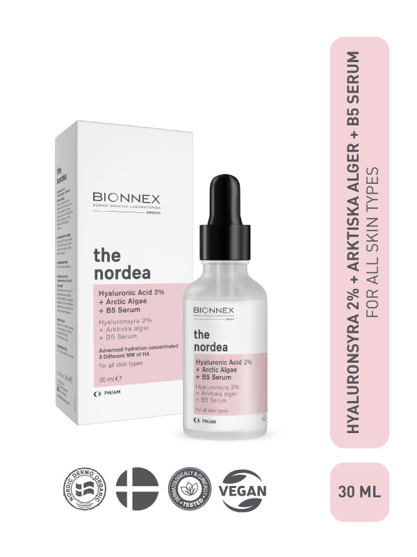 Bionnex The Nordea Hyaluronic Arctic Algae B5 Serum is an intensive hydrating treatment designed to deliver visible plumpness, long-lasting hydration, and improved skin resilience. Developed using advanced dermocosmetic science, this serum combines three molecular weights of hyaluronic acid to provide multi-layer moisture penetration — hydrating the skin from surface to depth for a smoother, firmer, and more youthful appearance. Infused with Arctic Algae Extract, an ingredient sourced from the pristine Nordic environment, it helps strengthen the skin barrier while protecting against environmental stressors, pollution, and dryness. The addition of Vitamin B5 (Panthenol) enhances the skin’s natural repair process, soothes irritation, and locks in moisture for lasting comfort.