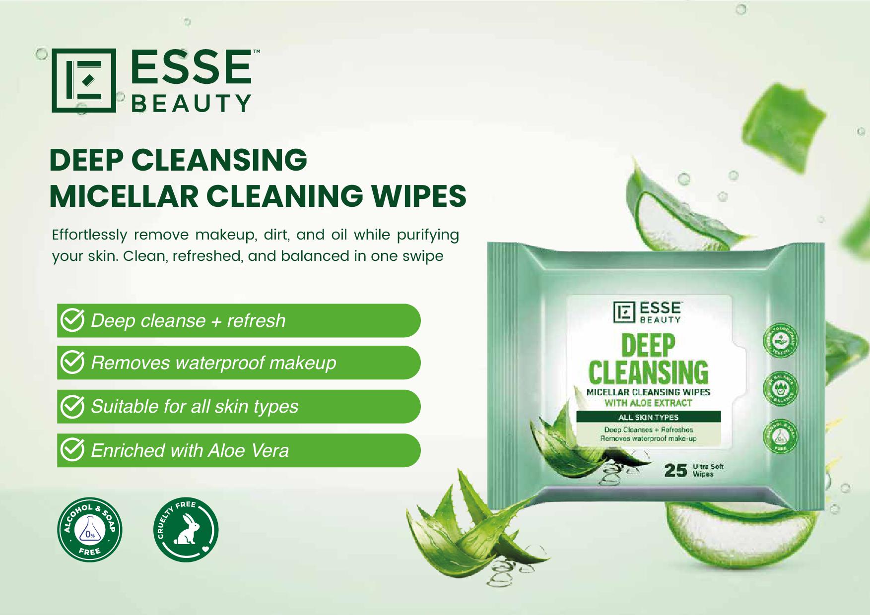 Esse Beauty Deep Cleansing Micellar Wipes, Aloe Vera, Waterproof Makeup Remover & Pore Purifying, 25s