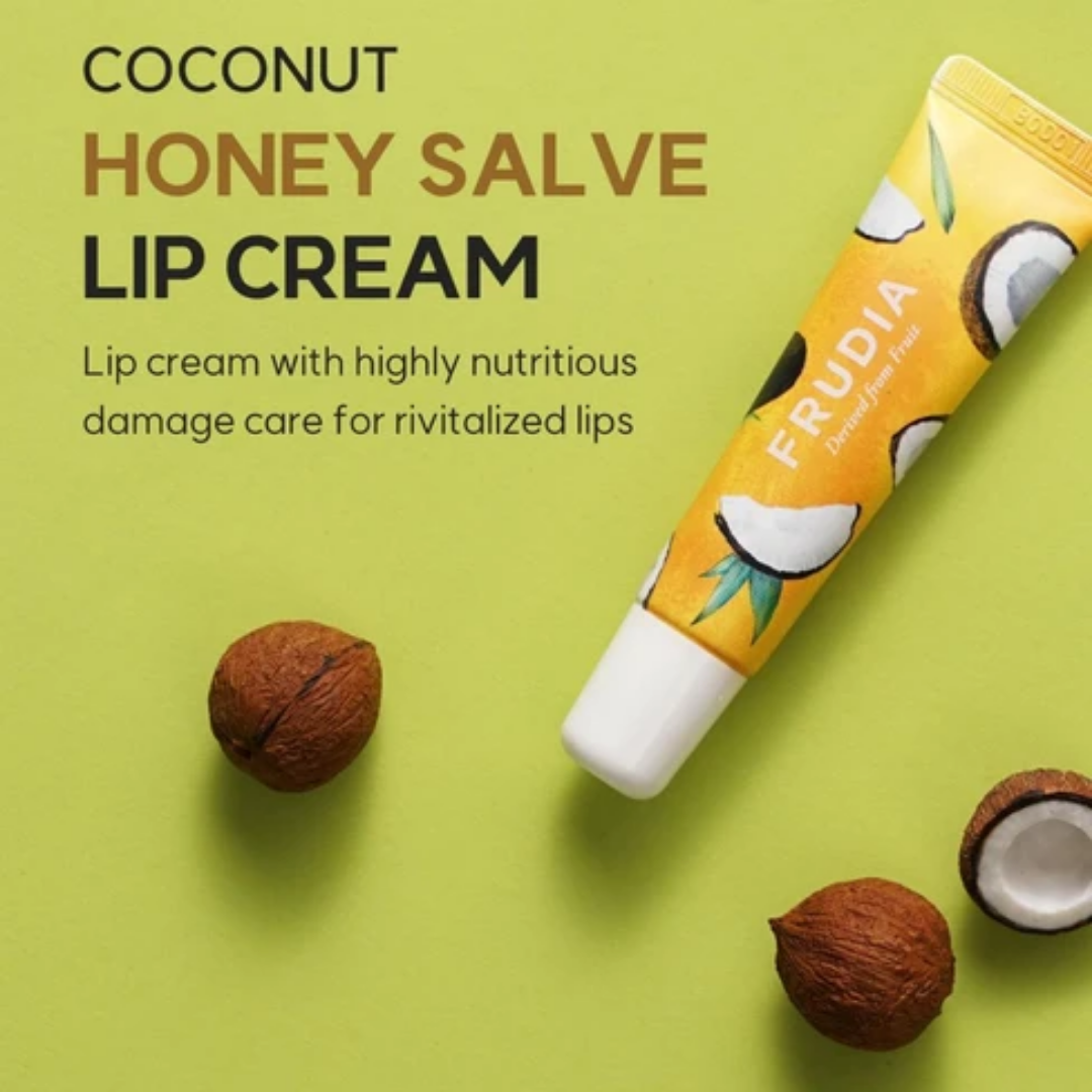 FRUDIA Coconut Honey Salve Lip Cream, is an ultra-rich salve lip cream with coconut oil and honey for deep healing, intense moisture, and all-day protection.