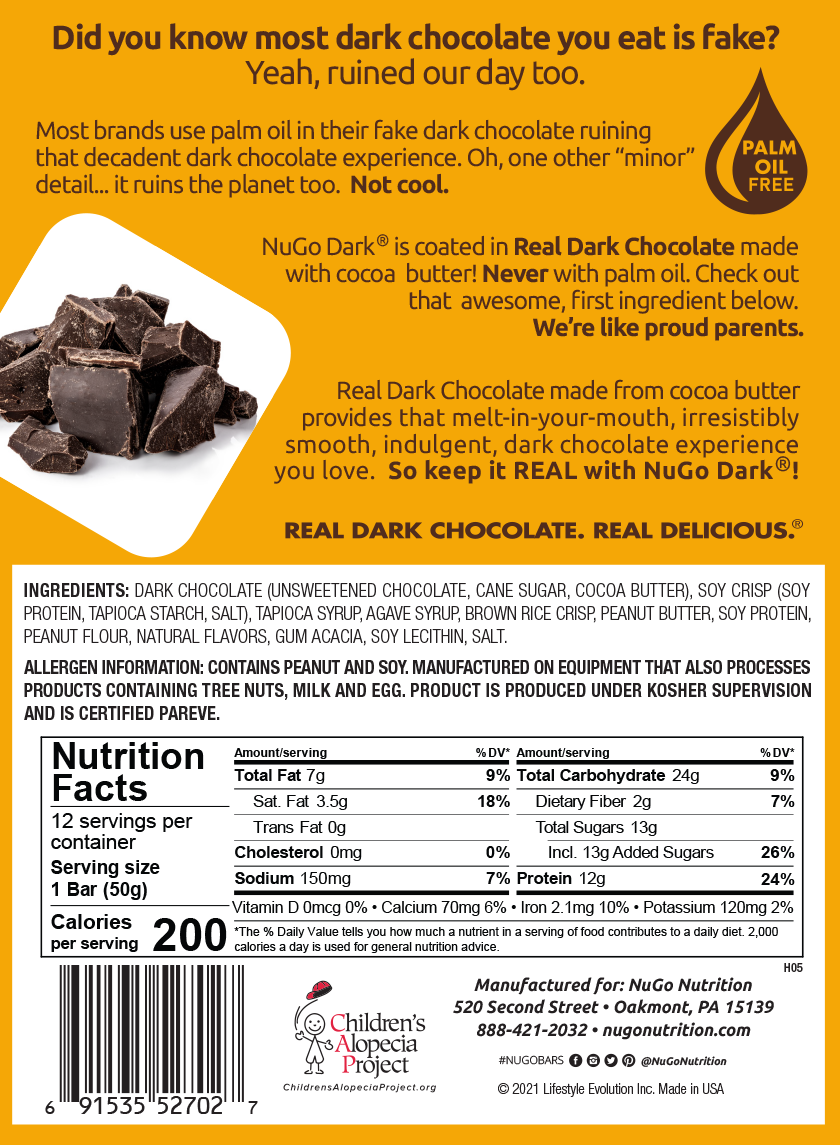- Real Dark Chocolate Coating made with cocoa butter and no palm oil
