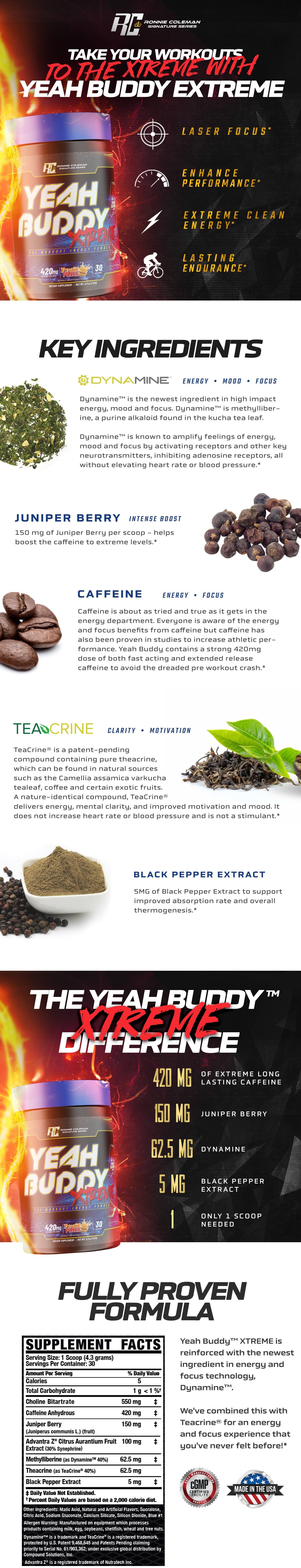 Dominate your workouts with Ronnie Coleman Yeah Buddy Xtreme Pre-Workout Grape, the ultimate energy amplifier for serious lifters and athletes. This advanced, high-performance formula delivers explosive energy, laser focus, and endurance to push through your toughest sessions. Yeah Buddy Xtreme combines Caffeine Anhydrous, Dynamine™, TeaCrine®, and Beta-Alanine to provide both an instant surge of energy and long-lasting stamina. These clinically researched ingredients enhance nitric oxide levels, support blood flow, and delay muscle fatigue—keeping you powered through every set and rep.
