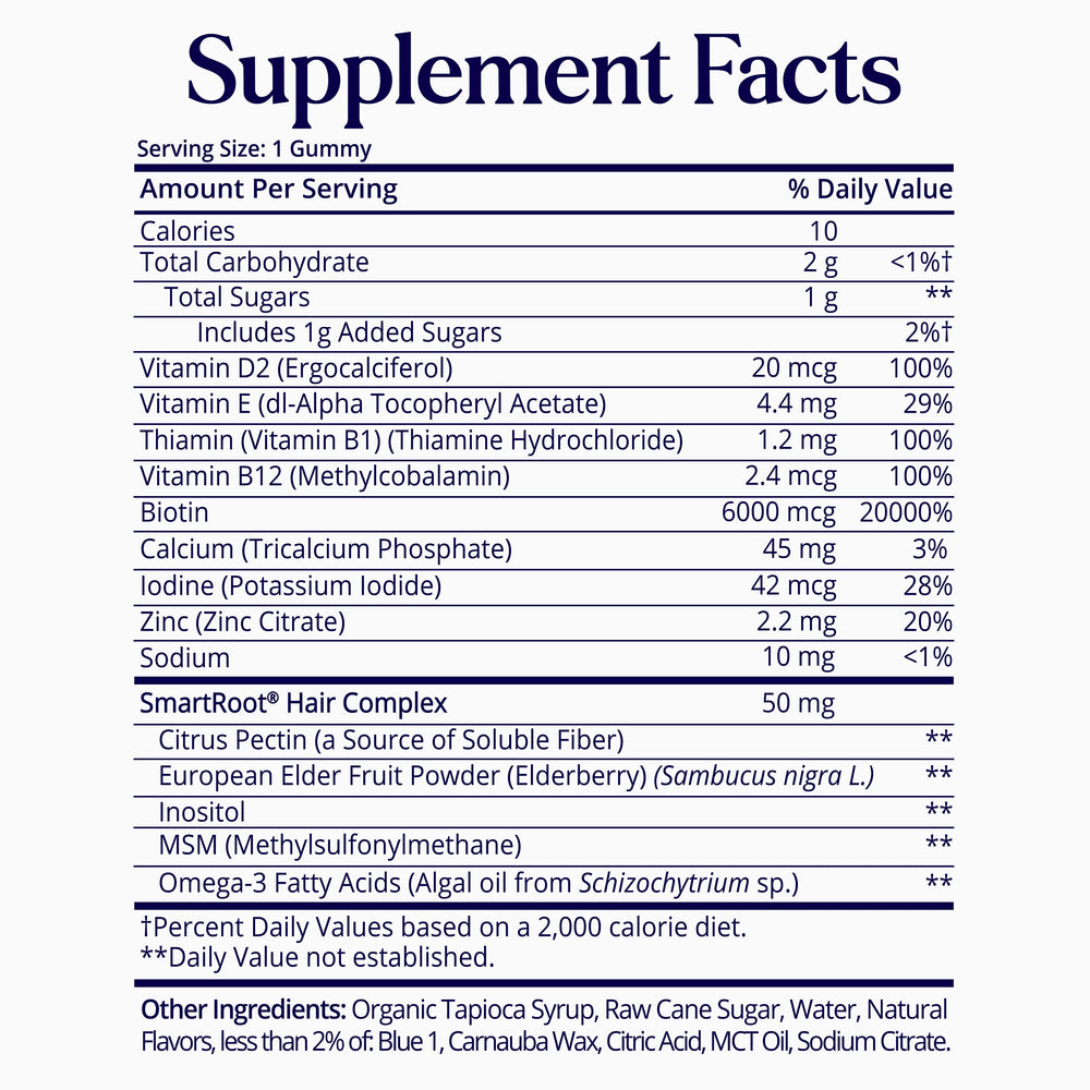 At the heart of this formula is the SmartRoot® Hair Complex, a proprietary blend featuring European Elderberry (a strong antioxidant), Inositol (for healthy growth cycles), MSM (supports natural keratin), Algal Oil Omega-3s (shine and hydration), and Citrus Pectin (nutrient absorption and internal balance).