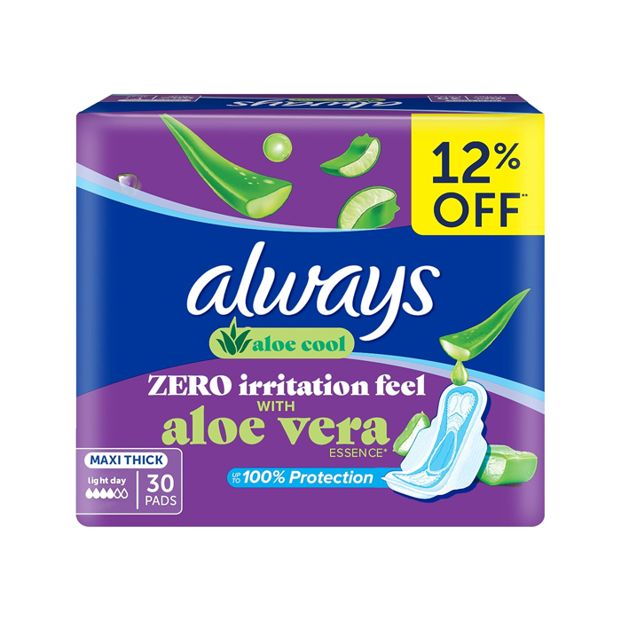Always Aloe Cool Maxi Thick Sanitary Pads with Wings - Light Flow Pads with Aloe Vera Essence, Cooling Comfort, Zero Irritation- 30 Count Value Pack