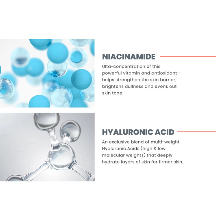 - Niacinamide helps improve skin barrier and brighten skin tone & texture.