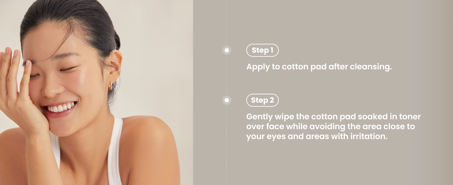 • Gently wipe the cotton pad soaked in toner over face while avoiding the area close to your eyes and areas with irritation.