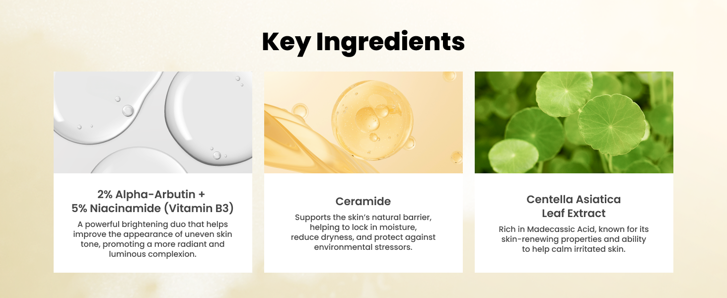 Water, Glycerin, Propanediol, Niacinamide, Butylene Glycol, Alpha-arbutin, Caprylic/Capric Triglyceride, Isohexadecane, Betaine, Ceramide NP, Centella Asiatica Leaf Extract, Adenosine, Sodium Ascorbyl Phosphate, Glutathione, Squalane, Allantoin, Asiaticoside, Centella Asiatica Extract, Madecassoside, Houttuynia Cordata Extract, Morus Alba Root Extract, Phaseolus Radiatus Seed Extract, Canavalia Gladiata Seed Extract, Glycine Soja (Soybean) Seed Extract, Lens Esculenta (Lentil) Seed Extract, Ceratonia Siliqua (Carob) Seed Extract, Pueraria Lobata Root Extract, Brassica Oleracea Italica (Broccoli) Extract, Terminalia Ferdinandiana Fruit Extract, Hippophae Rhamnoides Fruit Extract, Malpighia Glabra (Acerola) Fruit Extract, Sodium Hyaluronate, Hydroxypropyltrimonium Hyaluronate, Sodium Acetylated Hyaluronate, Hydrolyzed Hyaluronic Acid, Hyaluronic Acid, Sodium Hyaluronate Crosspolymer, Hydrolyzed Sodium Hyaluronate, Potassium Hyaluronate, Acetyl Octapeptide-3, Dipeptide-1, Tripeptide-2, Palmitoyl Dipeptide-7, Dipeptide-4, sh-Oligopeptide-1, 1,2-Hexanediol, Glyceryl Stearate, Hydrogenated Lecithin, Acrylates/C10-30 Alkyl Acrylate Crosspolymer, Sorbitan Sesquioleate, Ethylhexylglycerin, Hydrogenated Olive Oil Unsaponifiables, Xanthan Gum, Hydroxypropyl Cyclodextrin, Lactobacillus Ferment Lysate, Chlorphenesin, Sorbitan Stearate, Stearic Acid, Phytosterols, Arginine, Disodium EDTA, Caprylyl Glycol, Melia Azadirachta Flower Extract, Ocimum Sanctum Leaf Extract, Melia Azadirachta Leaf Extract, Curcuma Longa (Turmeric) Root Extract, Corallina Officinalis Extract, Polyglyceryl-10 Laurate.