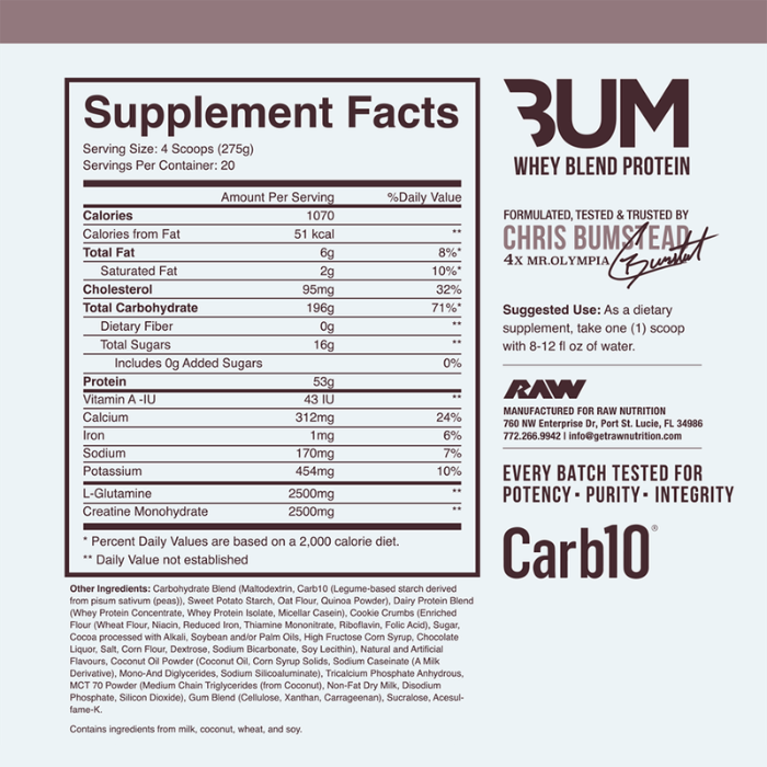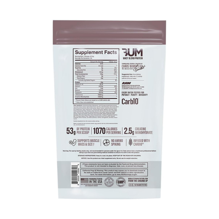 The powder blends easily with water or milk, making it convenient to prepare shakes for post-workout recovery or between meals. With its large 12 lb container, Bum Mass Gainer provides multiple servings suitable for long-term use during bulking phases or muscle-building programs. It can be incorporated into a balanced diet and active lifestyle to help support higher calorie intake and performance goals.