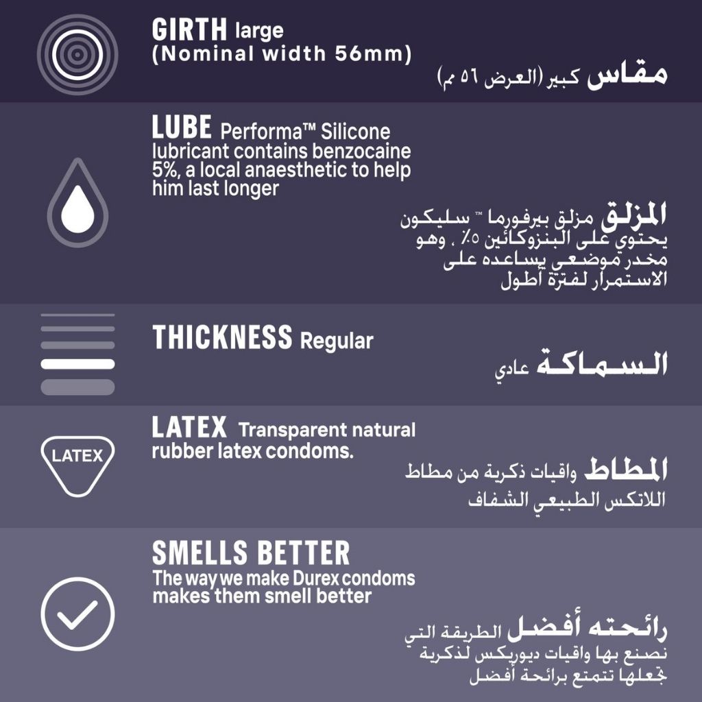 Durex Extended Pleasure Condoms contain special Performa lubricant (5 percent benzocaine) inside the condom to help him last longer. The specific way Durex make their condoms means they smell better, so there will be no unpleasant distractions - you can just relax and enjoy.