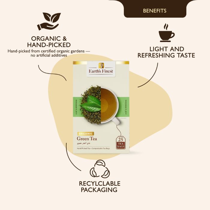 Earth’s Finest Organic Green Tea is made from tea leaves that are carefully handpicked from organically grown tea plantations. The finest leaves are selected and naturally dried to preserve its goodness.