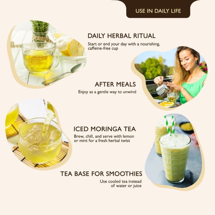 Every cup of moringa tea will provide your body with vital nutrients that is loaded with antioxidants and vitamins that will help clear your mind and boost energy levels. Moringa Tea is well respected and thought to be an excellent defense against free radical damage to your cells and thereby improving overall health.