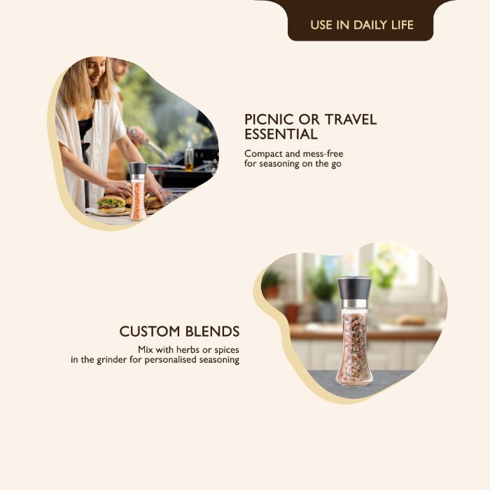 - PRACTICAL GRINDER: Packed and sealed in an attractive glass grinder, the glass is not only recyclable but also looks great on any family dining table. This easy to use grinder, serves several different purposes grinding down larger clumps of salt to distribute evenly. Close the lid after use to keep the product fresher for longer.