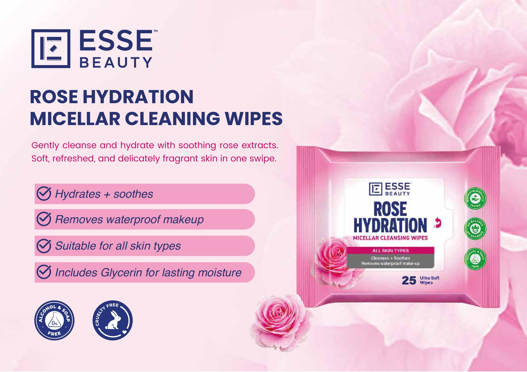 Esse Beauty Rose Hydration Micellar Cleansing Wipes, Hydrating Makeup Remover with Rose Extract & Glycerin, 25s