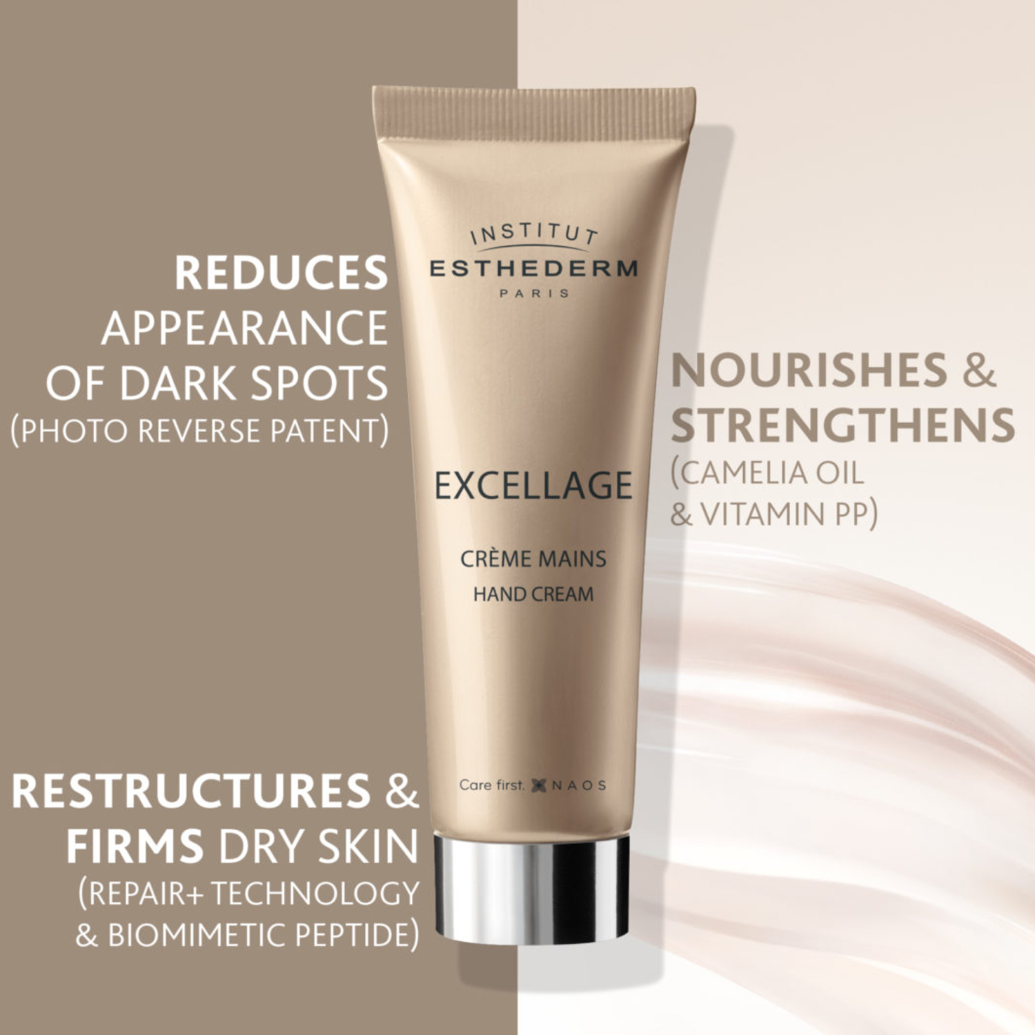 - Excellage Hand Cream visibly firms dry skin (REPAIR + Technology) and reduces the appearance of dark spot (Photo Reverse Patent).