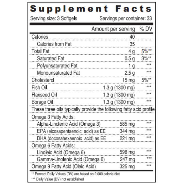 Sunshine Nutrition€™s Omega 3-6-9 is a blend of complex essential fatty acids (EFA) from 3 rich natural sources- Fish, Flax, and Borage. This scientifically optimized blend includes a healthy balance of EPA and DHA, in addition to ALA, LA, GLA and Oleic acid for promoting cardiovascular health cognitive function, skin health, joint function, and overall wellbeing.