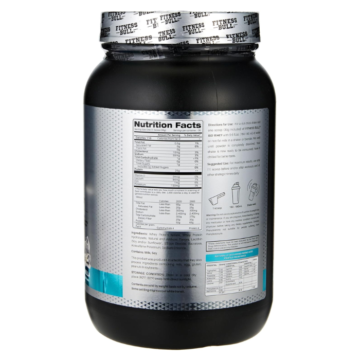 PUREST WHEY PROTEIN FITNESS BULL ISO WHEY protein provides 25grams of highest quality whey protein derived through a series of micro-filtration, multi-step Purification process that preserves important muscle building protein fractions while removing excess fat, cholesterol, carbohydrates, sugar and lactose for maximum purity, Mixability and lean muscle gains ! This superior formula is free of any added fillers, sugar or gluten and contains no doping ingredients to help you perform at your peak! This low calorie- low carb- low fat formula gives the highest value of Branched Chain Amino Acids (BCAA’S ) of 5.5g derived from natural whey protein isolate source along with naturally occurring Glutamine To support maintenance of lean muscles after a strenuous workout.