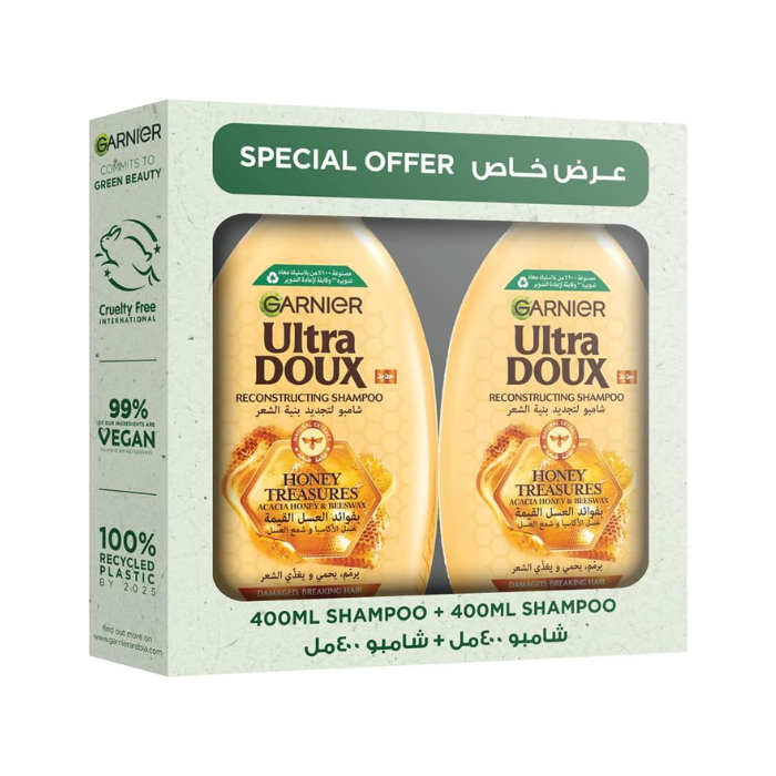 Garnier Ultra Doux Honey Treasures Reconstructing Shampoo, Nourishing Hair Repair, 2x400ml