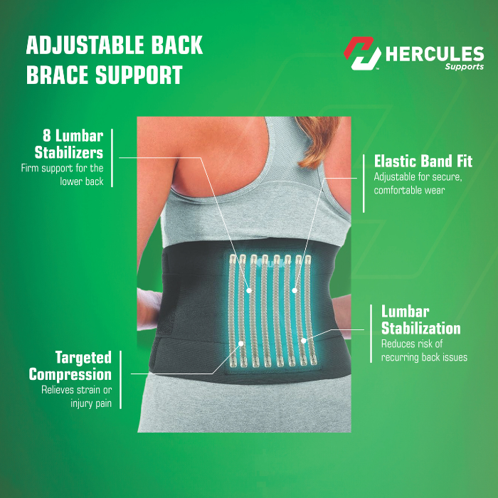 Get all-day back support with the Hercules Adjustable Back Brace Support UNIV. Designed to relieve lower back pain, correct posture, and provide lumbar stabilization. Fully adjustable for universal fit and all-day comfort. Ideal for work, gym, or daily wear.
