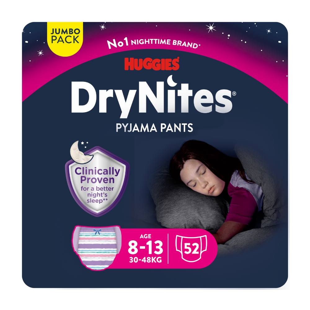 Did you know that up to 1 in 10 children wet the bed? DryNites are special, discrete pyjama pants designed to help parents sensitively tackle this stage in their child's development. A solution especially designed for bedwetting children, featuring an absorption capacity based on the age range. A good night's sleep assured, with Unbeatable night-time protection.