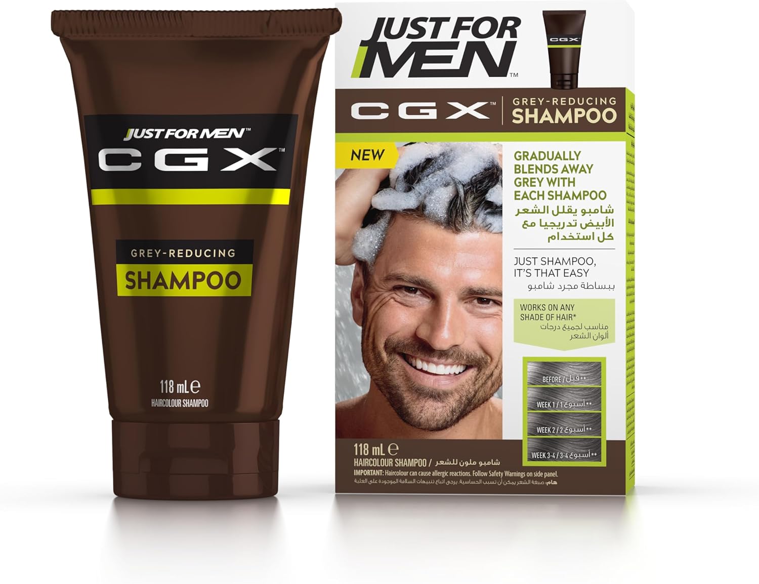 Reduce grey hair naturally with Just for Men Control GX Shampoo. Its patented formula gradually blends grey with every wash while gently cleansing and conditioning hair. Designed for subtle, natural-looking results, it enhances shine and texture. Perfect for busy men who want a gradual, low-maintenance solution to grey hair.