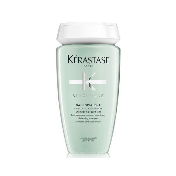 - Apply the Kérastase Bain Divalent Shampoo for oily scalp and dry hair to wet hair.