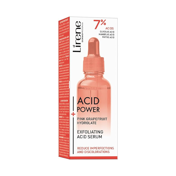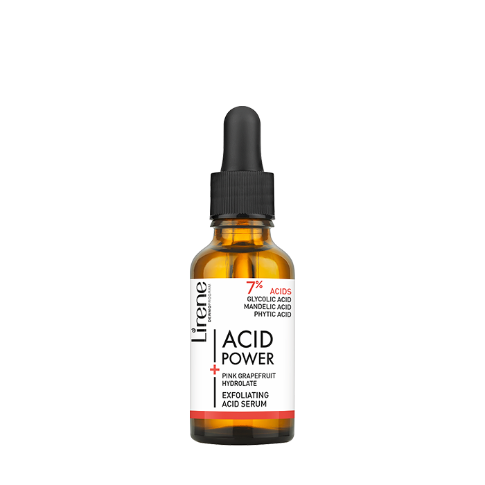 ACID POWER EXFOLIATING SERUM for hyperpigmentation and acne prone skin. LIRENE ACID POWER is an innovative formula containing a unique combination of professional acids in high - 7% concentration and soothing hydrolats. Appropriate pH minimises the risk of irritation and unattractive shedding of the skin, allowing regular, non-aggressive stimulation of cell regeneration. The treatment gradually smooths the skin texture and tone, so the face regains its youthful freshness and radiance.