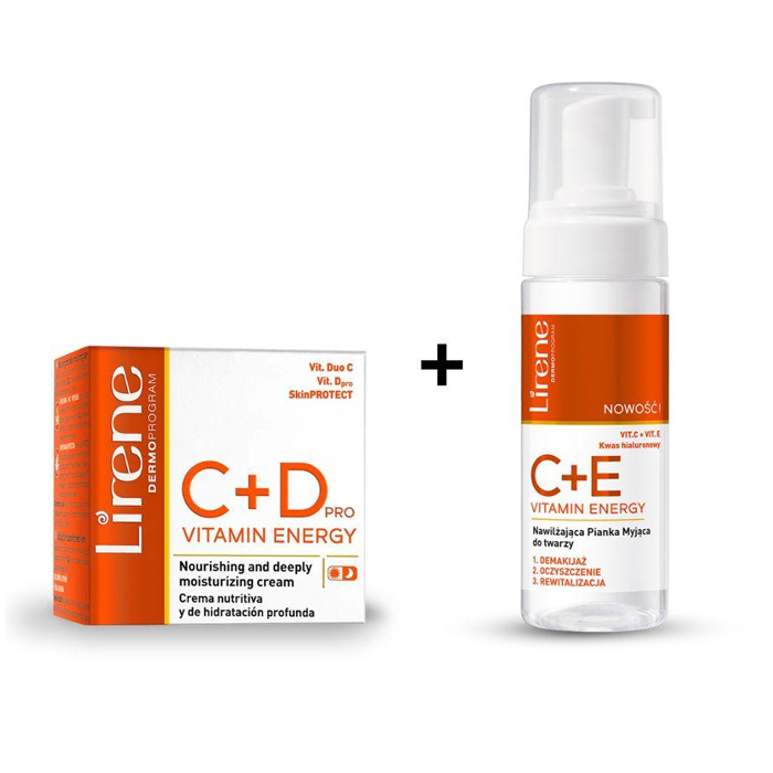 Lirene C+E+D VITAMIN ENERGY Moisturising facial cleansing foam + Nourishing and deeply moisturising cream Velvety creamy cleansing foam in an extremely pleasant and gentle way removes makeup, excess sebum, and other impurities. Unique compination of ultra-modern form of vitamin DuoC, in combination with vitamin Dpro, protects the skin’s multidimensional quality, guaranteeing spectacular ettects.