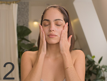 Apply : Use the natural weight of your hands to distribute the product evenly over your face and neck. {8 seconds}