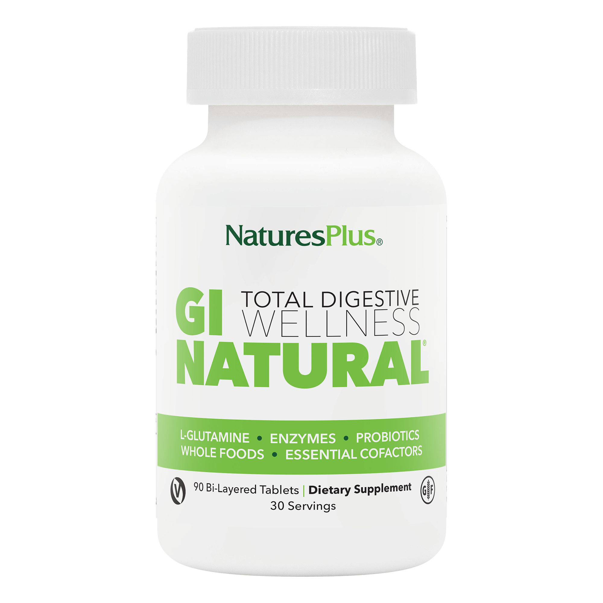 GI Natural Total Digestive Wellness by Nature's by Nature's Plus is a clinically designed formulation of high-potency L-Glutamine complexed with synergistic and supportive nutrients for a healthy GI mucosal tract. Optimal digestive health and overall wellness depend on a healthy gut, and GI Natural Total Digestive Wellness not only helps heal the GI tract's vital mucosal lining but strengthens and vitalizes this tissue. Uniquely formulated as a bi-layered tablet, the fast-release layer optimizes digestive comfort and energy, while the slow-release layer cleanses and rejuvenates. Feel the soothing natural comfort of a healthy digestive tract with the power of GI Natural Total Digestive Wellness.
