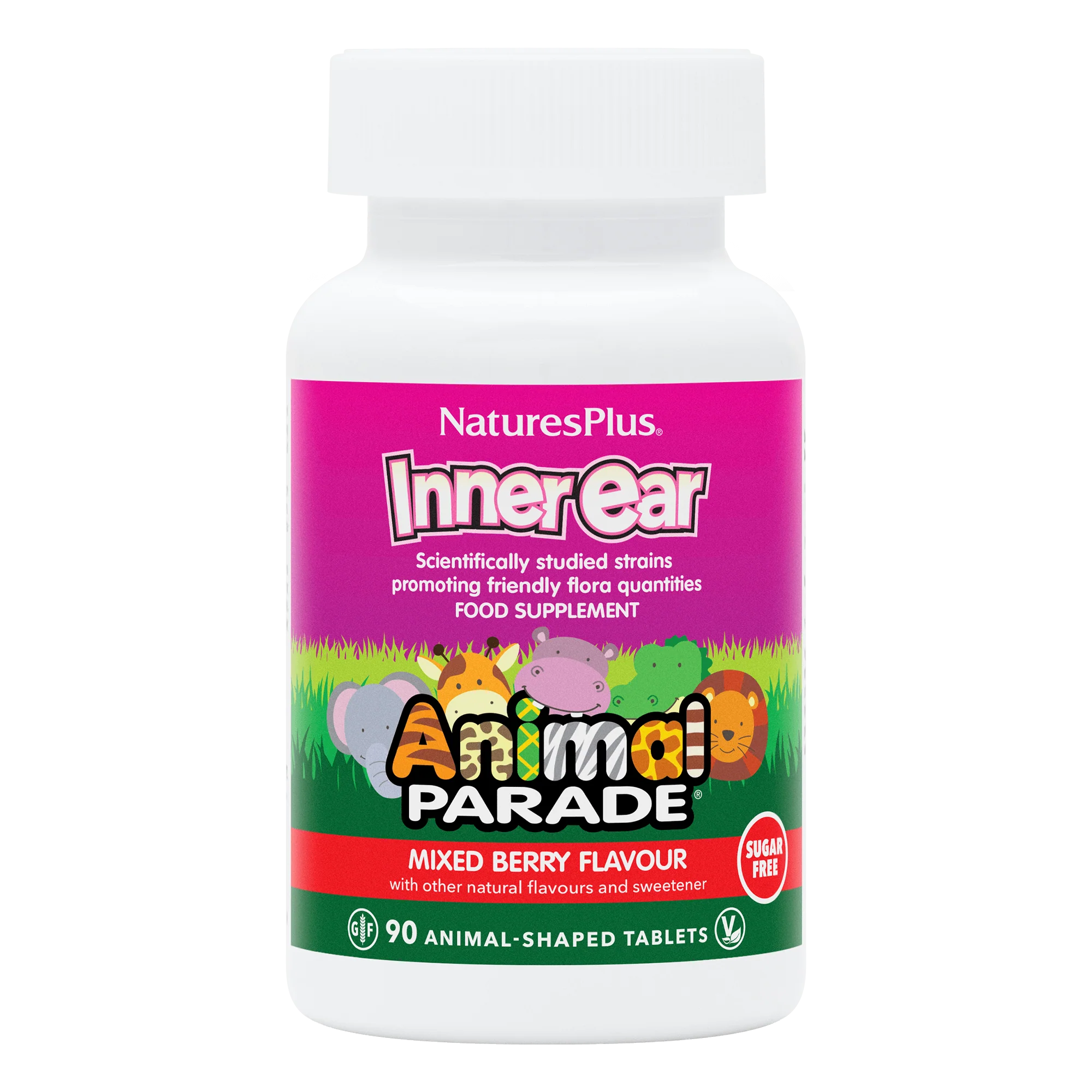 Animal Parade® Childrens Chewable Inner Ear Support formula is the most exciting advance in probiotics since the discovery of Lactobacillus acidophilus! This irresistibly delicious natural cherry-flavored chewable brings the power of K12 probiotics to the inner ear and throat; right where children need it most! With Animal Parade Childrens Chewable Inner Ear Support supplement, parents can enlist the help of billions of live probiotic cells to maintain a balanced ecology in the inner ear, mouth, and throat. Reinforced with the cooling, calming, soothing activity of chamomile and mullein extracts, Animal Parade Children's Chewable Inner Ear Support supplement offers complete probiotic support for maximum inner ear health.