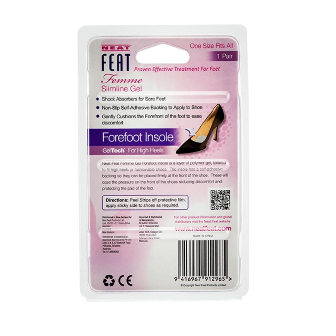 Neat Feat Femme Gel Forefoot insole is a double-layered superior polymer gel, tailored to fit high heel and fashionable shoes. The insole has an adhesive backing so they can be placed firmly at the front of the shoe. These will ease the pressure on the front of the shoes reducing discomfort and protecting the pad of the foot.