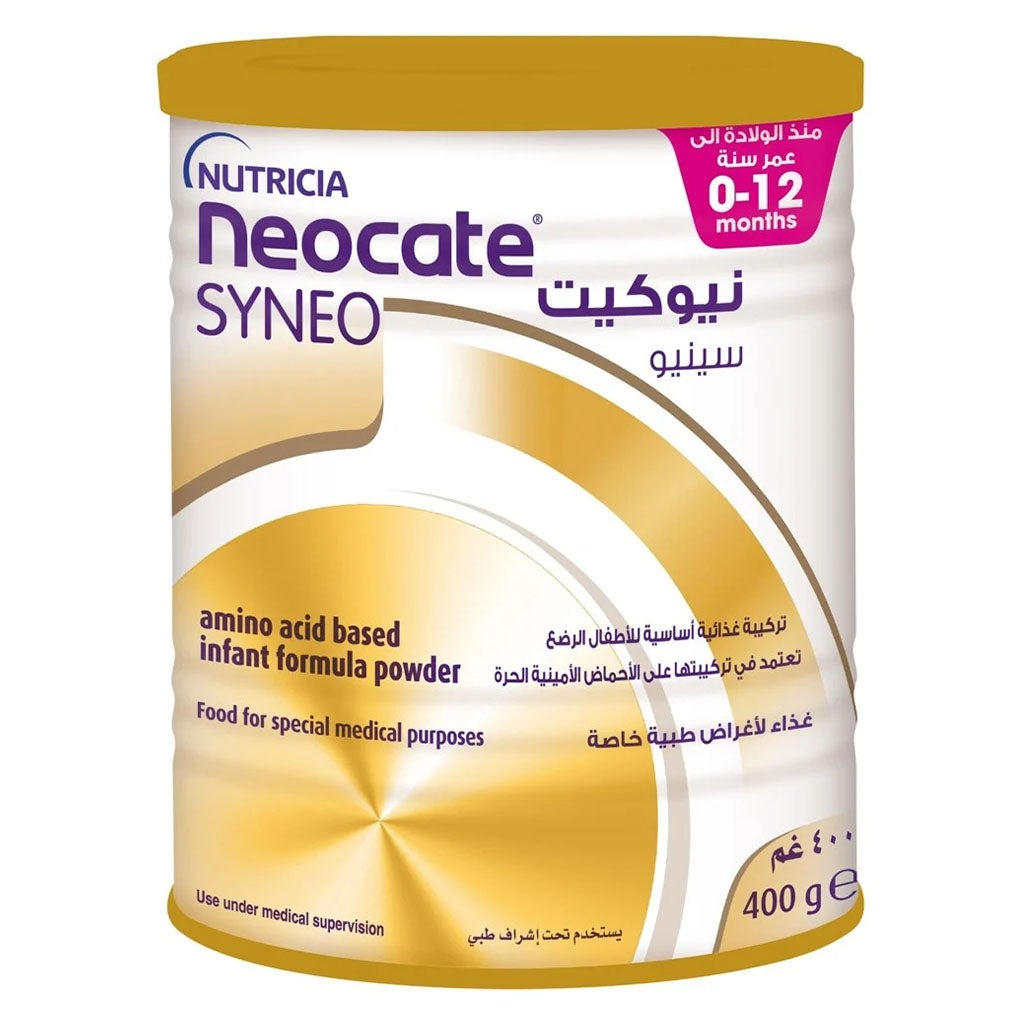 Neocate Syneo Milk Formula 400g is a nutritionally complete, amino acid-based infant formula crafted to meet the unique needs of infants with cow milk allergy (CMA), multiple food allergies (MFA), and related gastrointestinal or allergic conditions such as food protein-induced enterocolitis syndrome (FPIES), eosinophilic esophagitis (EoE), and gastroesophageal reflux (GER). Manufactured by NUTRICIA, a trusted name in pediatric nutrition, Neocate Syneo sets itself apart as the only hypoallergenic infant formula featuring a clinically tested blend of prebiotics and probiotics. This blend is scientifically tailored to support the developing immune and digestive systems of infants with severe food allergies. Each can contains 400g of specialist formula designed to support growth and optimal development right from birth through to 12 months of age, or as directed by your healthcare provider.