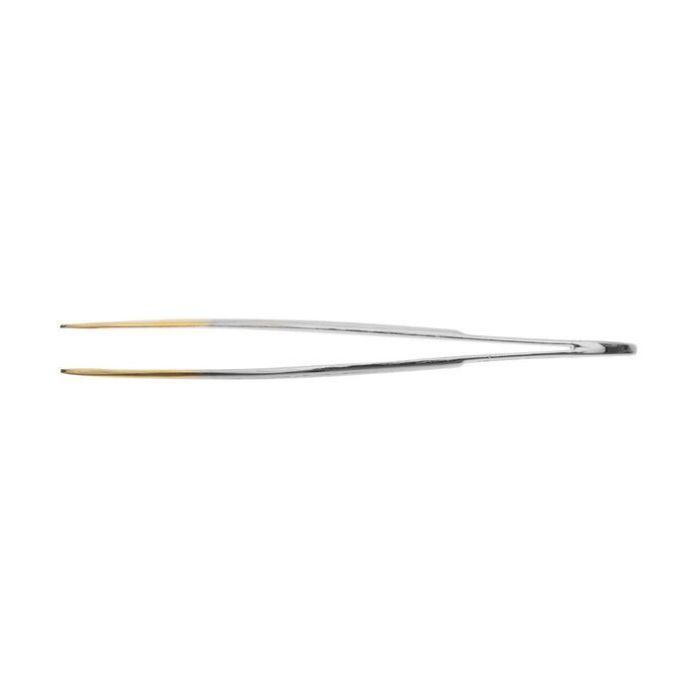 Classical tweezer with an pointed tip. This tweezer is optimal usable for remove splinters, single hairs and ingrown hairs. Made from high quality steel, nickel plated wiht an golden tip. Length: 9 cm