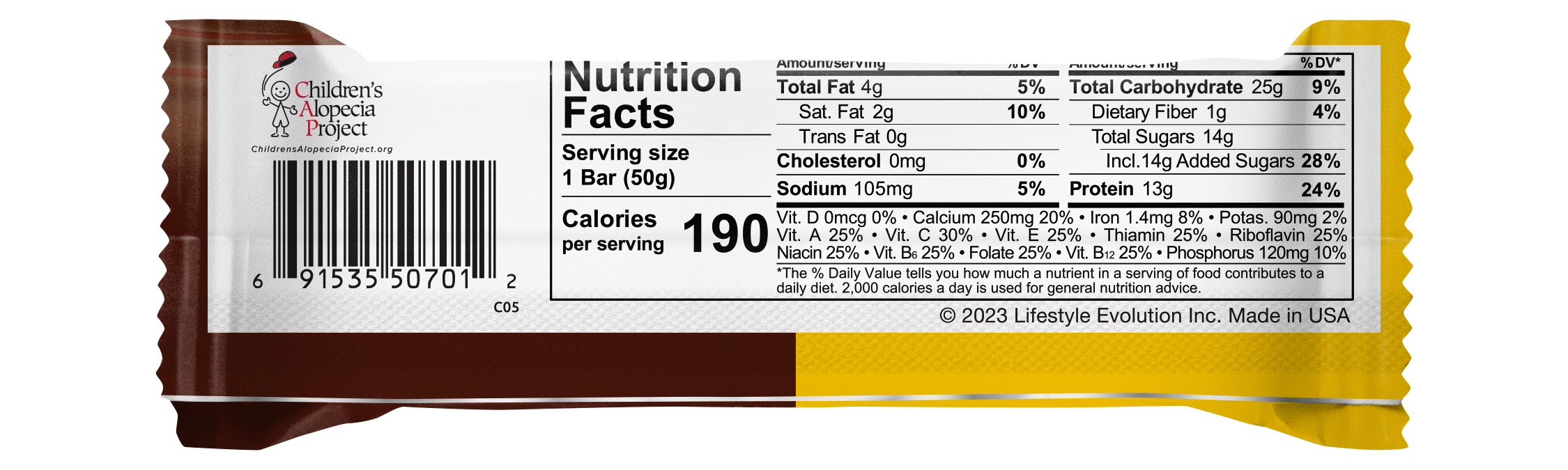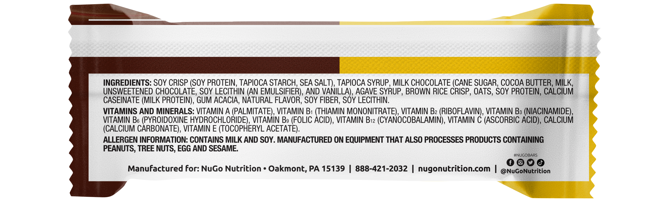 Ingredients : Soy crisp (soy protein, tapioca starch, sea salt), tapioca syrup, milk chocolate (cane sugar, cocoa butter, milk, unsweetened chocolate, soy lecithin (an emulsifier), and vanilla), agave syrup, brown rice crisp, oats, soy protein, calcium caseinate (milk protein), gum acacia, natural flavor, soy fiber, soy lecithin.
