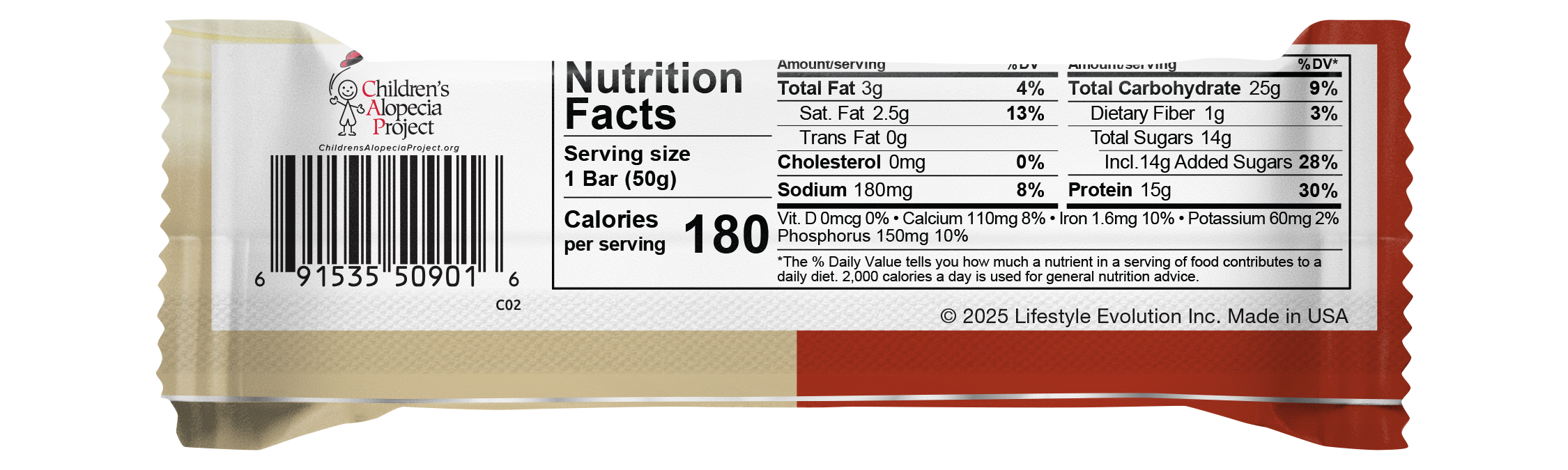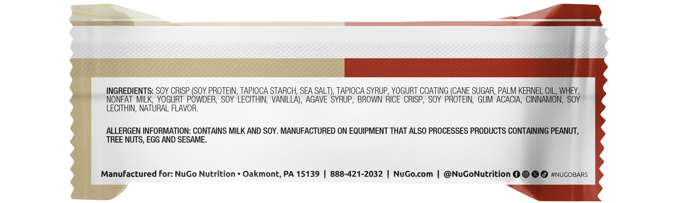 Ingredients : Soy crisp (soy protein, tapioca starch, sea salt), tapioca syrup, yogurt coating (cane sugar, palm kernel oil, whey, nonfat milk, yogurt powder, soy lecithin, vanilla), agave syrup, brown rice crisp, soy protein, gum acacia, cinnamon, soy fiber, natural flavor.