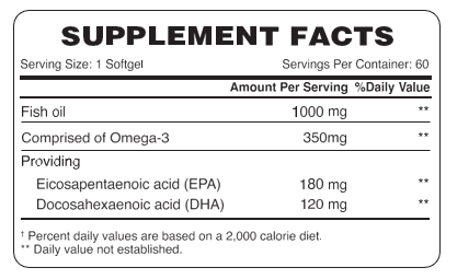 Ingredients : Active ingredients : Fish oil - 1000 mg, Omega 3 - 350 mg, Eicosapentaenoic acid (EPA) - 180 mg, Docosahexaenoic acid (DHA) - 120 mg