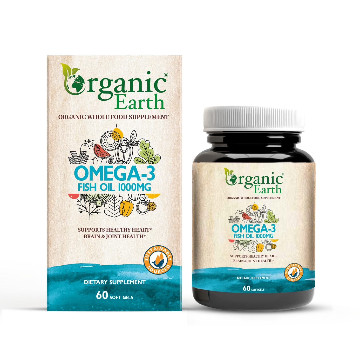 Omega-3 fish oil is derived from the fatty tissues of cold-water fish such as anchovies, sardines, and mackerel, and is rich in essential fatty acids EPA (Eicosapentaenoic Acid) and DHA (Docosahexaenoic Acid), which the body cannot produce efficiently on its own. Research shows omega-3s support cardiovascular health, brain function, eye wellness, joint mobility, skin health, and overall cellular vitality. Because modern diets often lack sufficient omega-3 intake, supplementation is a convenient way to maintain optimal fatty acid balance. Organic Earth Omega 3 Fish Oil 1000mg provides purified, high-quality fish oil to ensure potency, freshness, and safety for daily wellness and vitality.
