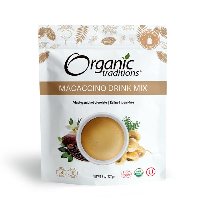 Organic Traditions Macaccino Drink Mix is a delicious, caffeine-free blend of organic maca root, cacao, and coconut palm sugar. A healthy coffee alternative with a smooth caramel-buttery taste that supports energy and hormone balance. Gluten-free, vegan, non-GMO, and peanut-free.