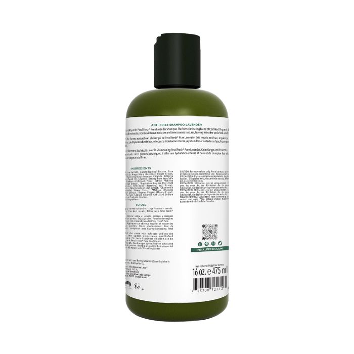 Petal Fresh Pure Lavender Anti-Frizz Shampoo delivers a calming, moisture-rich cleanse designed to smooth unruly, tangled, and coarse hair. Formulated with certified organic Lavender and a premium blend of botanical extracts, it deeply hydrates while naturally reducing frizz and enhancing shine. The gentle, pH-balanced base—crafted from plant-derived cleansers such as coconut-based surfactants and beet-derived betaine—cleans without stripping essential moisture, leaving hair soft, polished, and manageable.