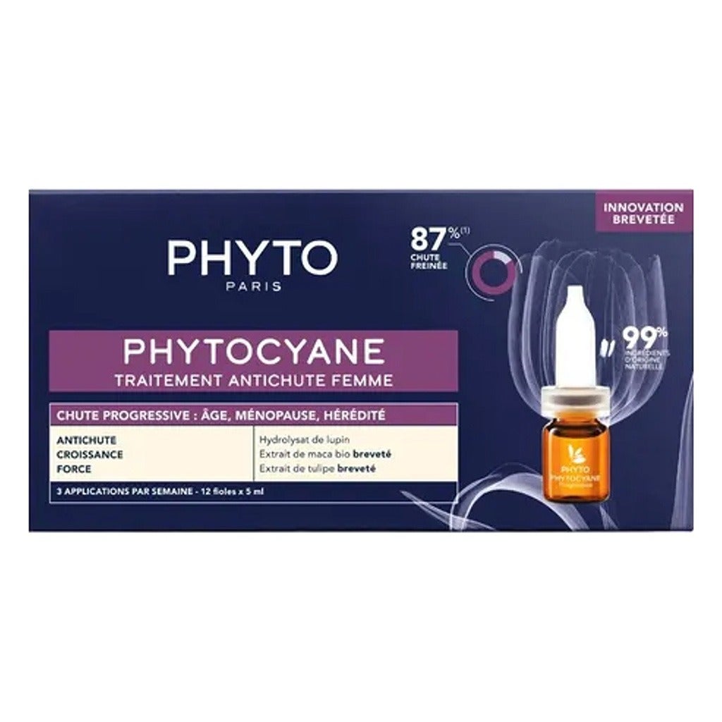 Phyto Phytocyanin Progressive Hair Loss Treatment for Women acts on progressive female hair loss caused by age, menopause or hereditary factors. A fall that is accompanied by hair thinning and a diffuse decrease in hair mass for more than 6 months. A formula with 99 percent ingredients of natural origin enriched with patented organic maca extract in lupine hydrolysate and patented tulip extract.