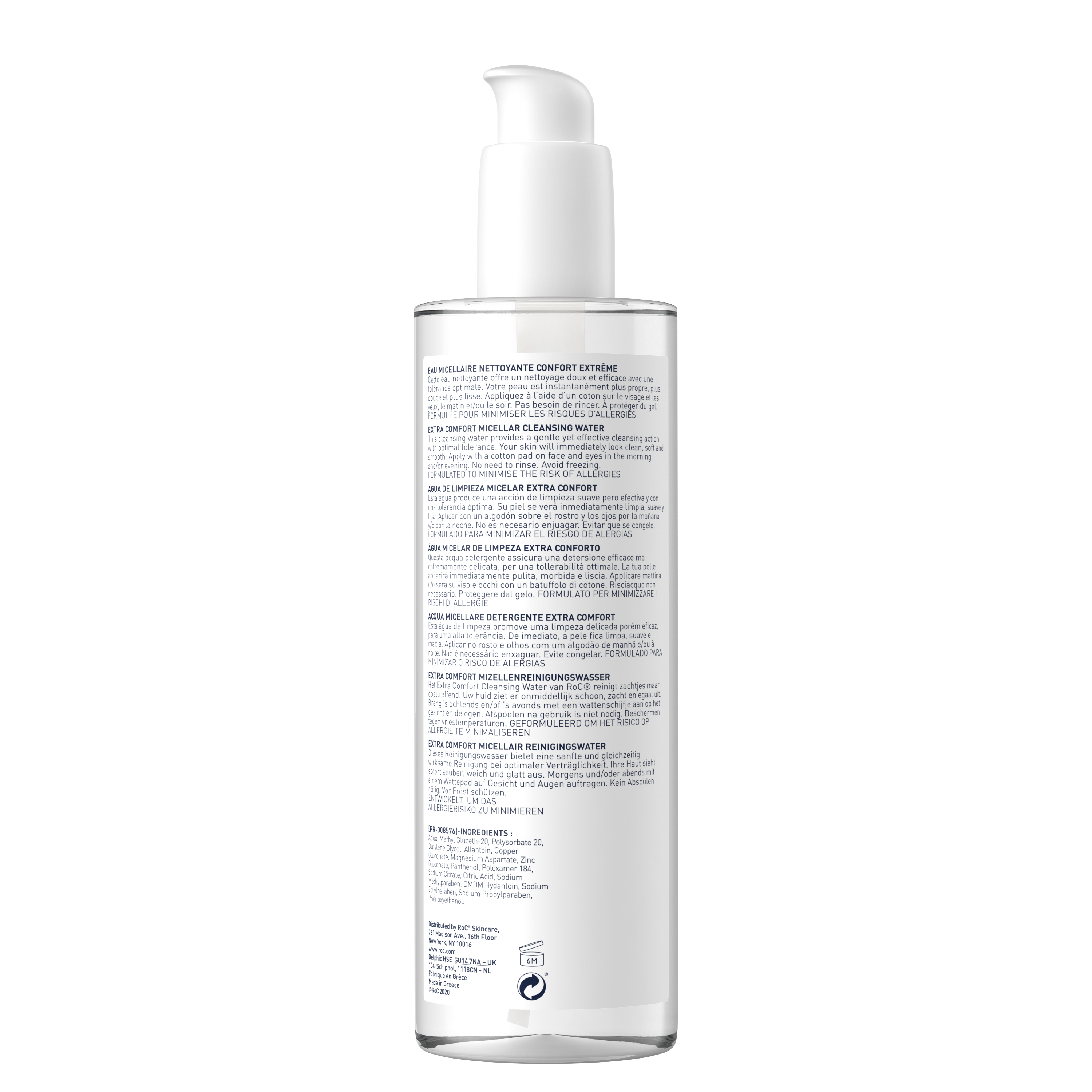 RoC Extra Comfort Micellar Cleansing Water 400ml gently removes makeup and impurities from face and eyes without irritation. Formulated for sensitive skin, it leaves skin clean, soft, and smooth with no need to rinse.