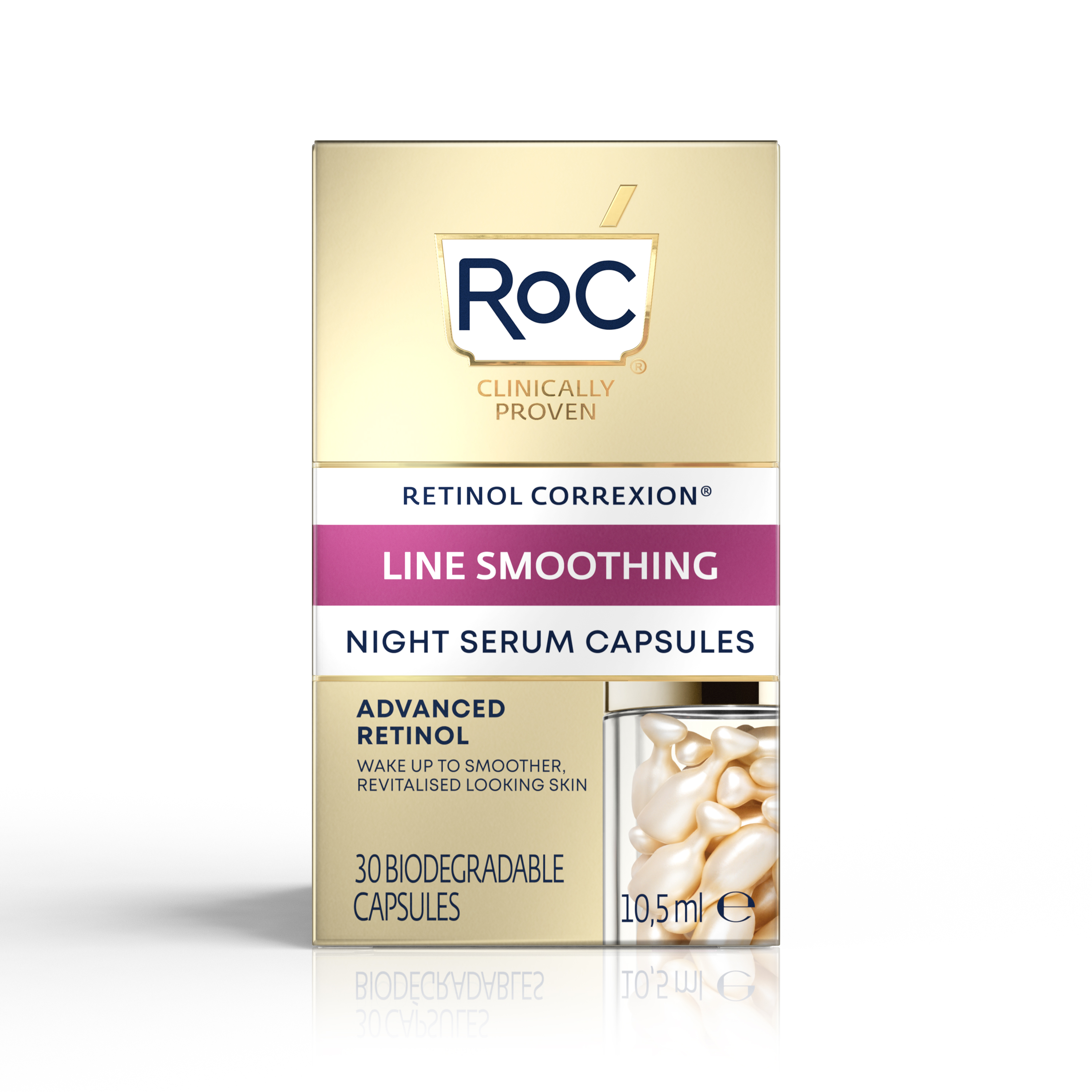 RoC Retinol Correxion Line Smoothing Night Serum capsules deliver a potent dose of pure retinol and antioxidants to visibly reduce fine lines and wrinkles. Clinically proven, fragrance-free formula improves skin texture, tone, and firmness while you sleep.