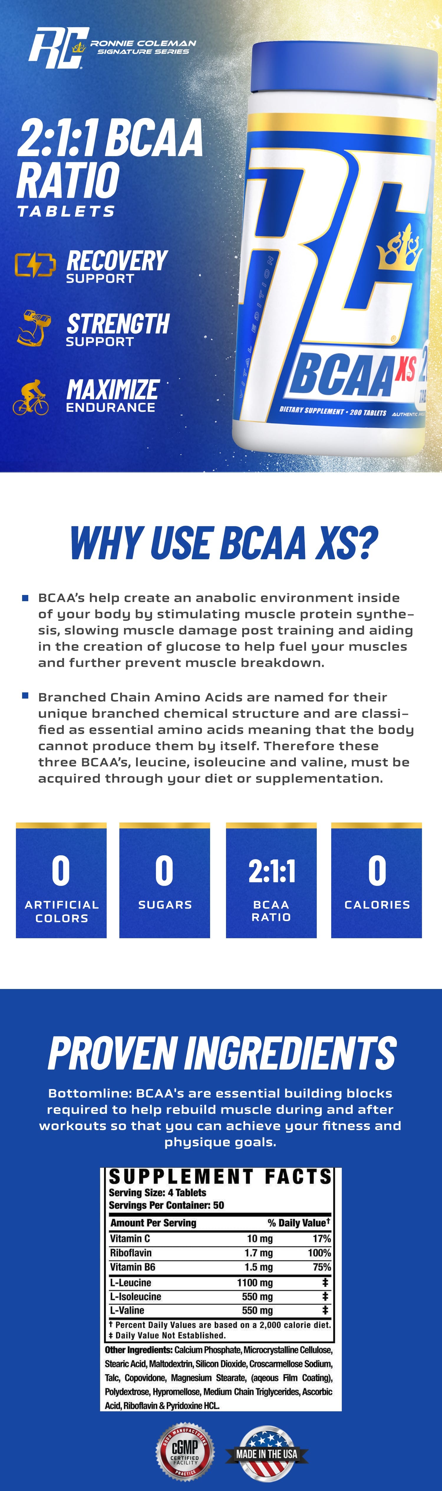 Ronnie Coleman BCAA-XS 400 Tabs deliver leucine, isoleucine, and valine in a 2:1:1 ratio to support muscle recovery, endurance, and strength. With zero calories, sugars, and artificial colors, this essential amino acid formula helps reduce breakdown, fuel performance, and promote lean muscle growth.