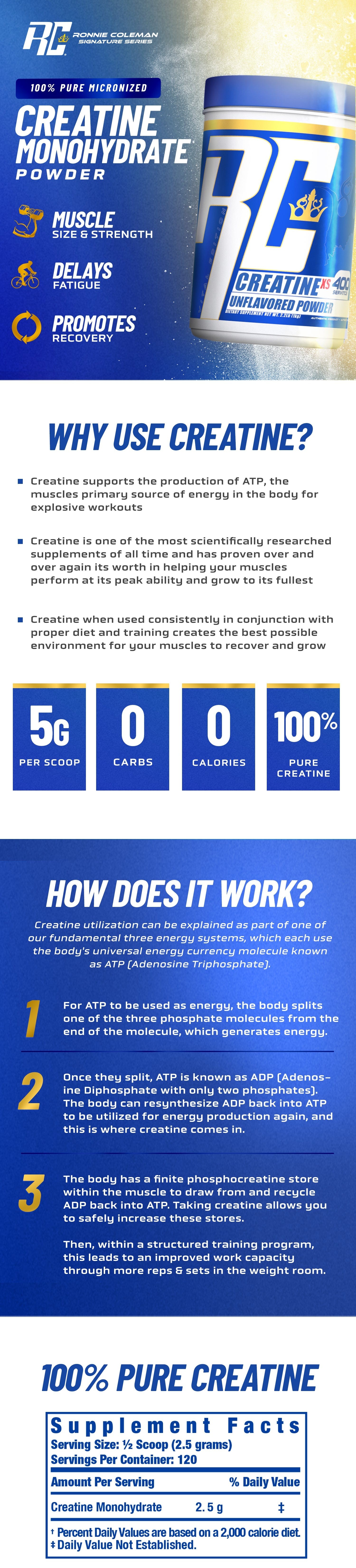 Ronnie Coleman Creatine-XS Unflavored, Pure Creatine Monohydrate for Muscle Strength and Recovery - 120 Servings