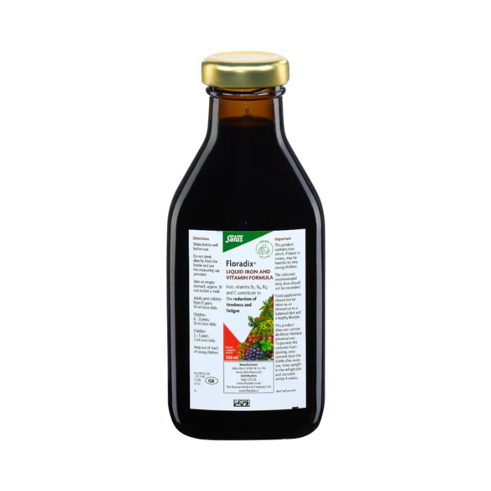 Floradix Liquid 250ml is a premium iron and vitamin formula developed in Germany by Salus. This carefully balanced liquid supplement provides organic iron from ferrous gluconate, combined with vitamins B¹, B², B⁶, B¹², and vitamin C to help reduce tiredness and fatigue while supporting normal energy-yielding metabolism. Iron contributes to normal red blood cell and haemoglobin formation, supported by vitamins B⁶ and B¹², while vitamin C enhances iron absorption. The liquid format ensures the nutrients are already dissolved, allowing for quicker absorption by the digestive system compared to tablets.