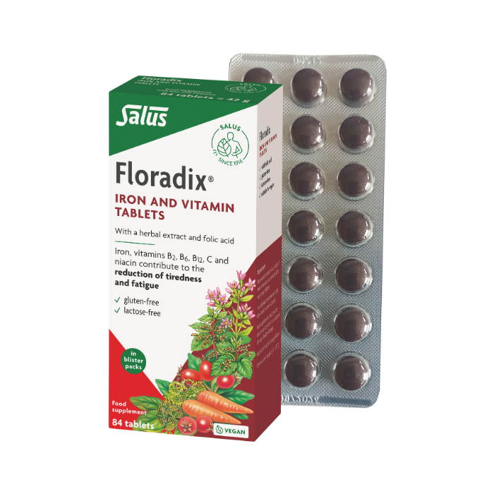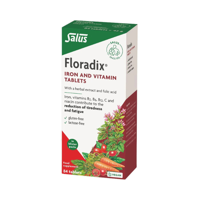 Floradix Iron Tablets by Salus are carefully formulated vegan iron tablets designed to support daily iron intake and energy metabolism. Each tablet contains organic iron (II) from ferrous gluconate, a well-absorbed form of iron, combined with essential vitamins including B2, B6, B12, C, niacin, folic acid, and B1.