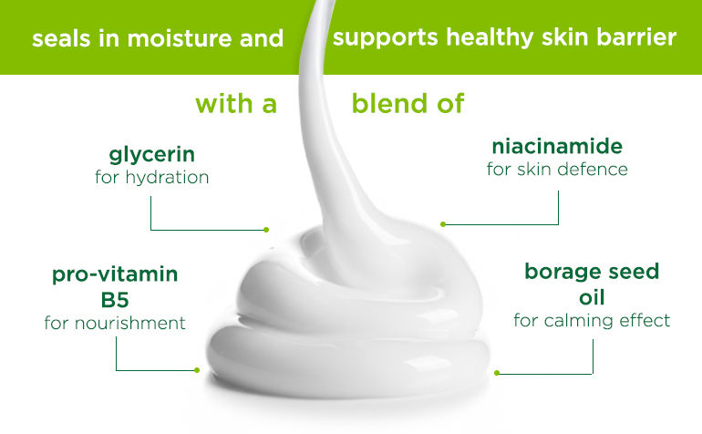 Ingredients : Water, Glycerin, Paraffinum Liquidum, Polyglyceryl-3 Methylglucose Distearate, Cetyl Palmitate, Dimethicone, C10-30 Acrylates/Acrylates Crosspolymer, Bisabolol, Borago officinalis Seed Oil, Caprylyl Glycol, Carbomer, Cetyl Alcohol, Disodium EDTA, Lactic Acid, Panthenol, Pantolactone, Pentylene Glycol, Phenoxyethanol, Potassium Carbonate, Potassium Hydroxide, Serine, Sodium Lactate, Sorbitol, Tocopheryl Acetate, Urea.