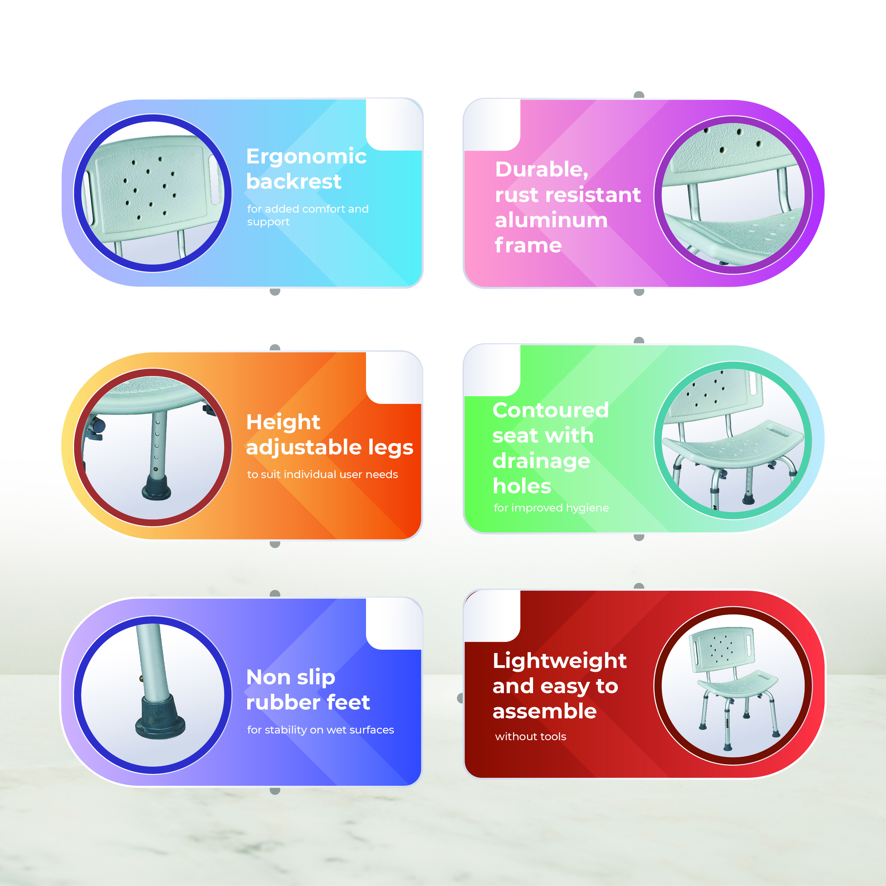 A sturdy and comfortable shower chair designed to provide safe and stable support for individuals during bathing.