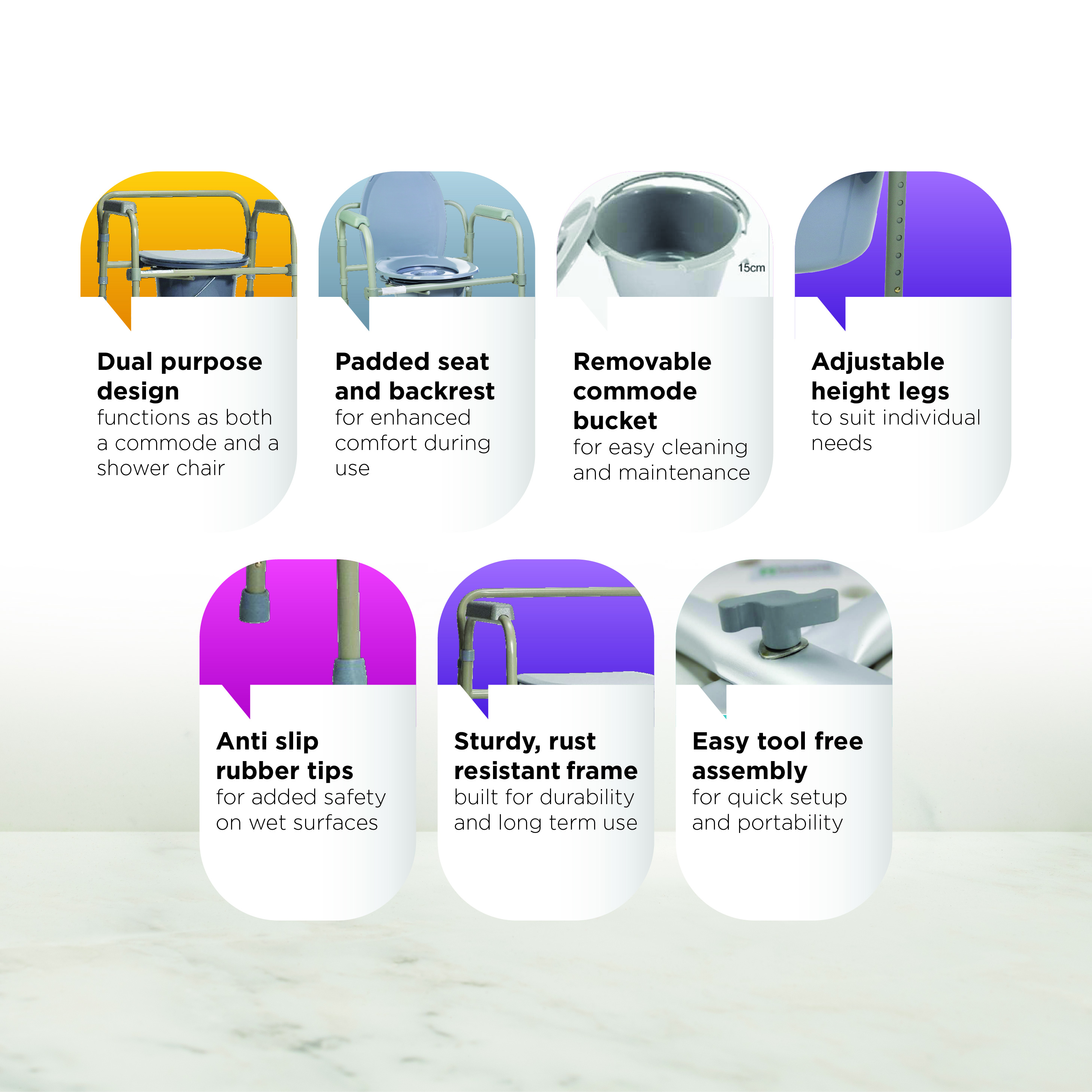 - Removable commode bucket for easy cleaning and maintenance ·