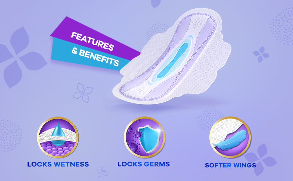 - Dry Top sheet keeping wetness away from skin, locks it inside the pad to prevent leakage