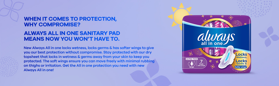When it comes to protection, why compromise? Always All in One sanitary pad means now you won't have to. Enjoy maximum dry protection with a top sheet that locks moisture away from skin and keeps you protected from germs. Softer wings safe guard you from leakage or irritation so you can move freely. Wear Always All in One sanitary pads for all-day unbeatable protection & live fearlessly!